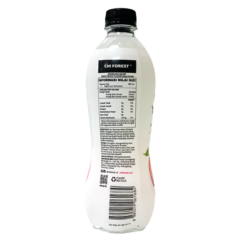 Air, Pemanis Alami (Eritritol (E968)), Perisa Sintetik Persik, Pengatur keasaman (Asam SItrat, Natrium Bikarbonat), Konsentrat Sari Buah Persik, (0.01%), Bahan Pengkarbonasi Karbon Dioksida, Pemnais Buatan Sukralosa)
